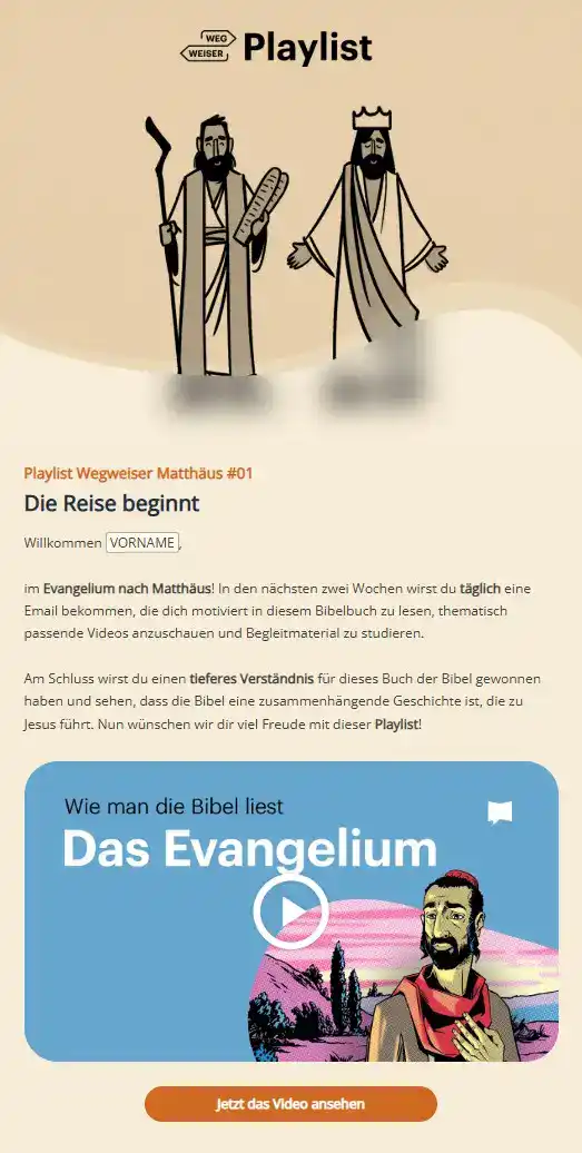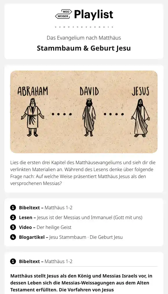 Der Wegweiser durch das Matthäusevangelium ist erst der Anfang. Unser Ziel ist es, zu jedem Bibelbuch einen Wegweiser zu erstellen. Hier findest du die Übersicht aller Playlists zu den Wegweisern.